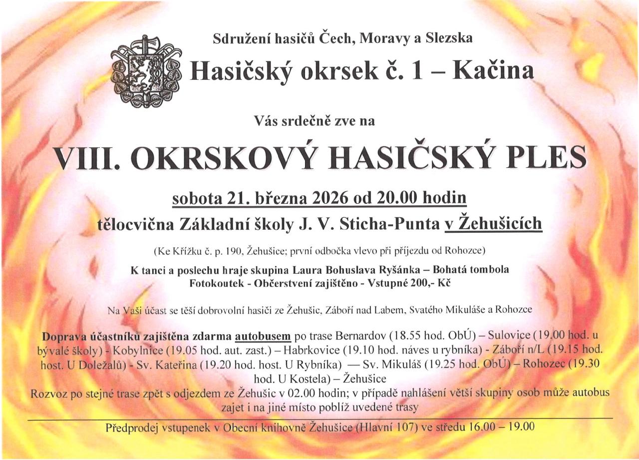 V sobotu 21. března 2026 se v tělocvičně Základní školy J. V. Sticha-Punta v Žehušicích uskuteční VIII. Okrskový hasičský ples.